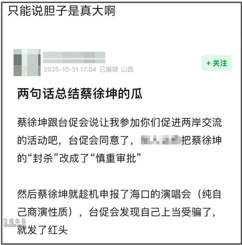 曾经的顶流蔡徐坤又被曝瓜了!爆料人身份更是让人意外,竟然是台促会副秘书长代替会长发声明,怒斥蔡徐坤团队侵犯了他们的权益。