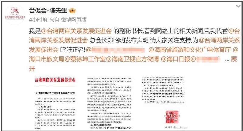 2025年8月,蔡徐坤被允许参加两岸交流演唱会;2025年9月,台促会得知其他演艺公司申报了蔡徐坤演唱会项目,两场演唱会位于同一地点,都在海南省海口市。