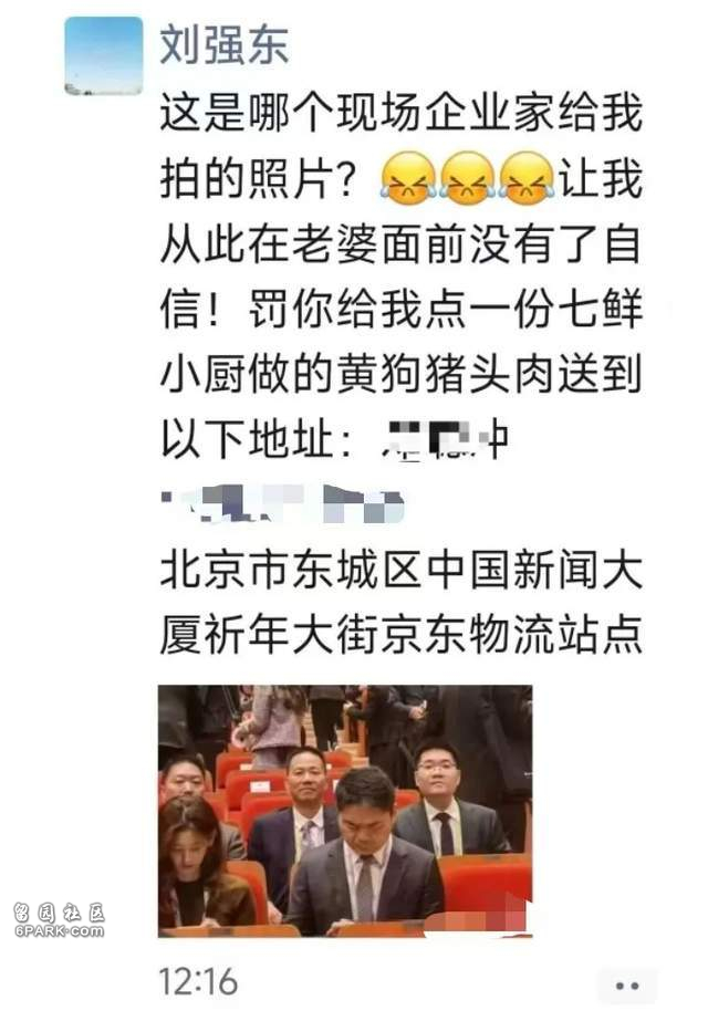 据晒出截图的网友称,该朋友圈确认是刘强东本人。朋友圈用户名称是刘强东,头像背景是蓝色天空,只见他晒出了一张与章泽天同时低头看手机的照片,开篇询问“是哪个现场企业家给拍的照片,让我从此在老婆面前没有了自信”,并搭配了几个哭泣的表情包。而后还以惩罚的口吻留下地址要对方帮他点外卖,无形间给自家商铺打广告了。