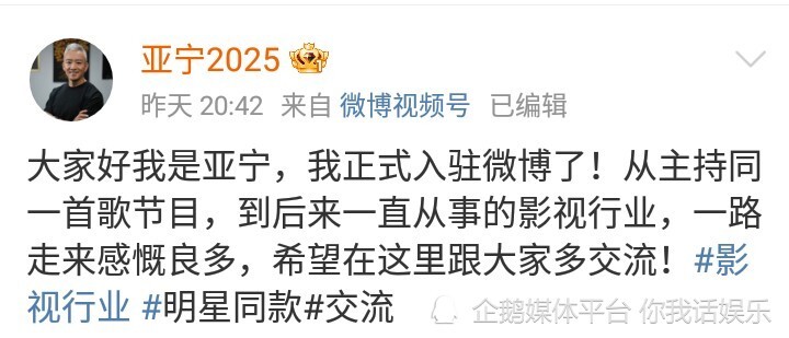 10月31日晚,前央视主持人亚宁通过他的新社交账号发布了第一条视频,宣布回归。上世纪90年代,亚宁是红极一时的主持人,他主持的《中国音乐电视》《同一首歌》等栏目风靡一时。