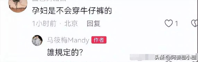 评论区里有人留言说“孕妇哪能穿牛仔裤啊,对孩子不好”,没过多久,马筱梅就回复了一句反问,虽然没直接说自己怀孕,但那态度明摆着是承认了这个消息。