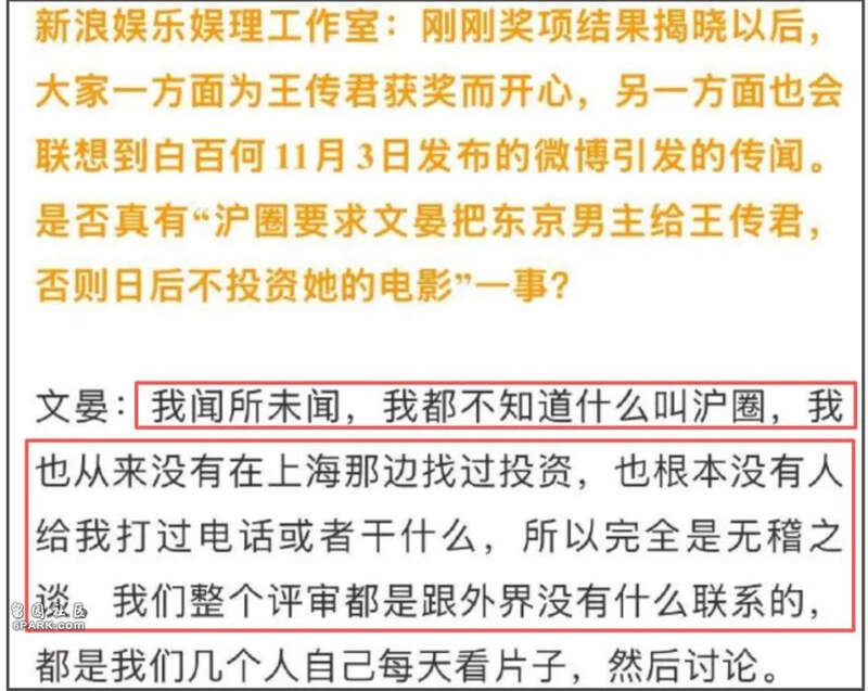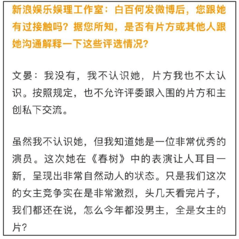 针对白百何发布的微博引发的质疑,文晏表示自己闻所未闻:“我都不知道什么叫沪圈,我也从来没有在上海那边找过投资,也根本没有人给我打过电话或者干什么,所以完全是无稽之谈。我们整个评审都是跟外界没有什么联系的,都是我们几个人自己每天看片子,然后讨论。”