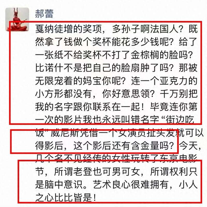 郝蕾用“名不见经传的几个女性玩转东京电影节”反讽了,表面是肯定女性电影人,实则暗指文晏作为女性评委,却在评选中偏向男性演员,甚至被传受“沪圈资本施压”,让奖项沦为资本博弈的工具,这与她“所谓权利只是脑中意识”的批判完全契合。文晏已经否认这种说法,不认识沪圈资本,也没有投过她的电影。