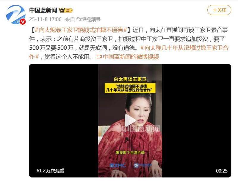 据11月8日报道,向太陈岚在直播间里的一番爆料,直接把导演王家卫送上了舆论的风口浪尖。她重提旧事,直言有片商投资王家卫时,在拍摄过程中被对方一直要求追加投资,“要了500万又要500万”,并痛批这种模式是“无底洞”,直指其“没有道德”。