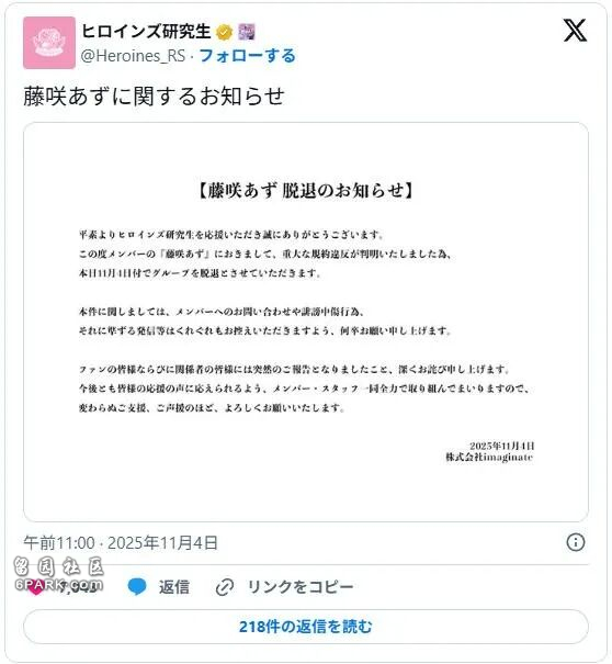 事件发酵了3天后,11月4日中午,日本偶像女团“HEROINES研究生”官方也正式发布声明强调,经判断藤咲AZU有严重违反规定的行为,决定自11月4日起让她退出团体。