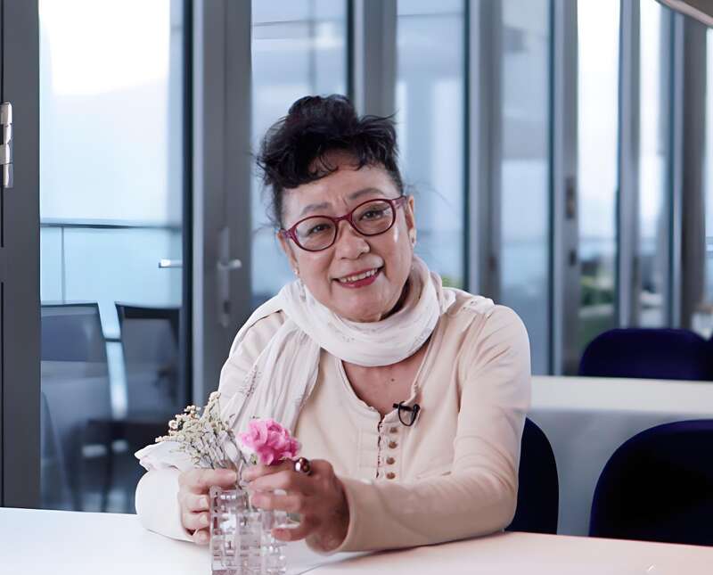 当天的黄文慧一身休闲打扮,金黄色的头发全部扎起来,脸部轮廓更显得圆润。架着黑框圆镜的她脸带微笑露出大白牙,脸色绯红有光泽,虽然肉眼可见岁月的痕迹,但状态依然精神抖擞,更竖起大拇指与杨玉梅合照,看上去心情极佳。