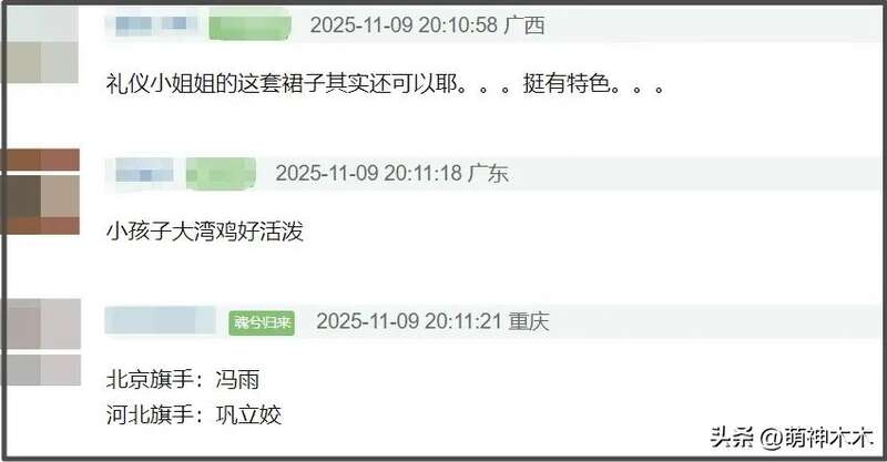 观看入场环节的网友们关注点一个比一个有趣,有人注意到各省市运动员方队旗手,有人注意到礼仪小姐姐裙子好看又有特色,有人注意到十五运会吉祥物活泼又可爱。