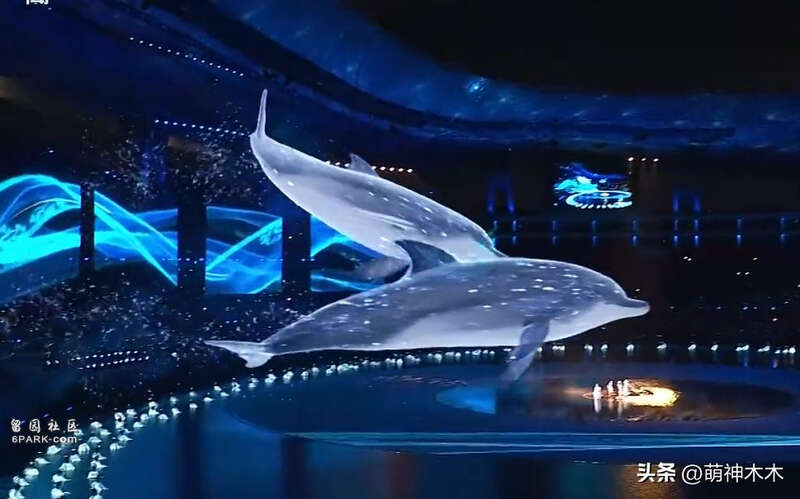 接下来就到开幕式文体表演了!第一个节目舞美设计格外惊艳,跳跃的白海豚、飞扬的船帆,是别有风味的渔家风情呢。