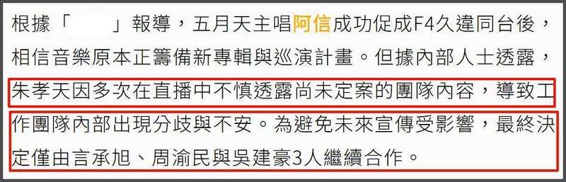 此前朱孝天在直播间直接曝光了后续F4会有单独的团体演唱会一事,还说已经在为了团体演唱会录新歌了,该说不该说的全都暴露,惹团队不满。