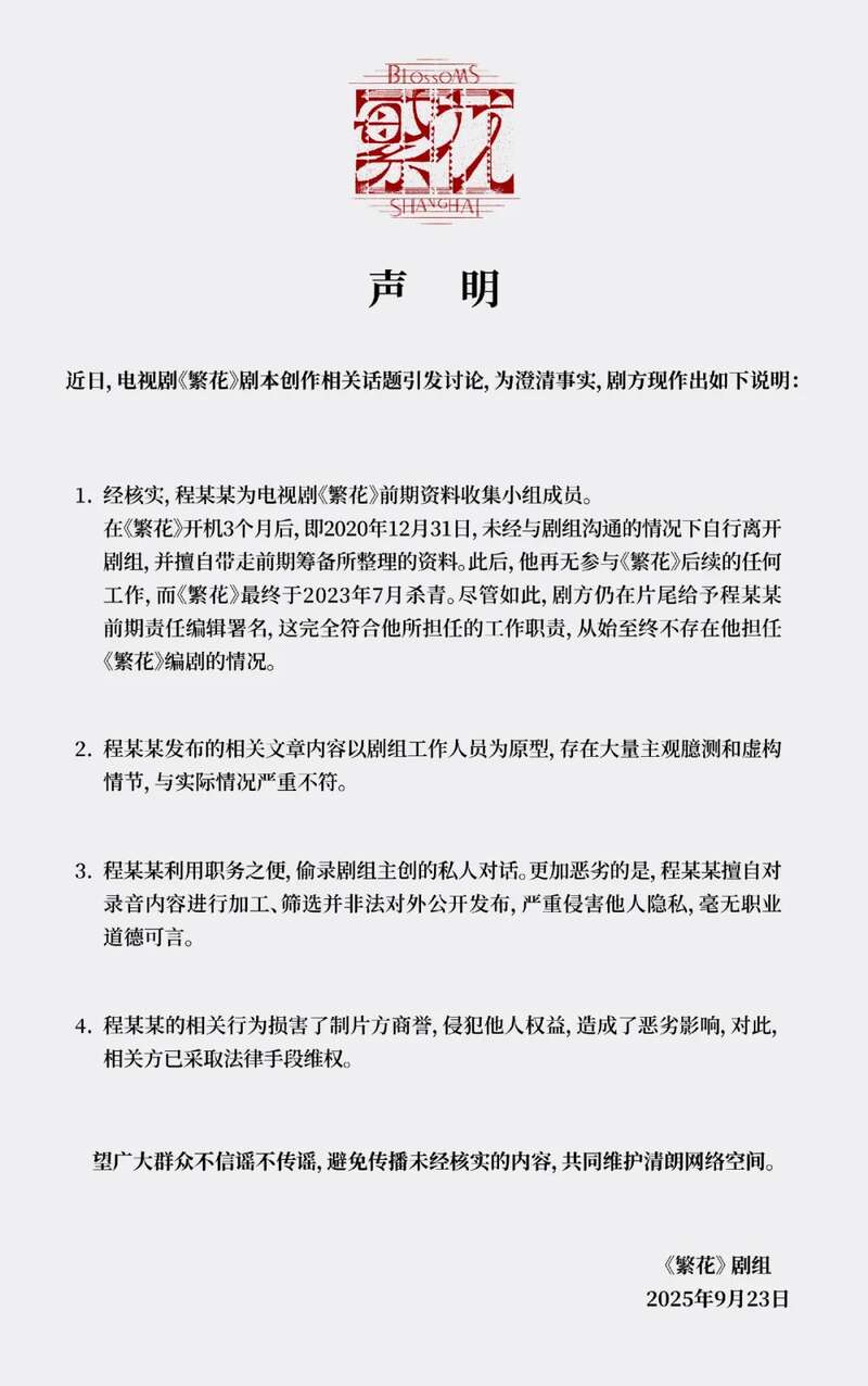 《繁花》剧组强烈谴责其违法行为,坚决维护所有主创成员的权益。针对程骏年实施的所有违法行为及其损害后果,剧组正在持续取证中,且已经提交给国家司法、执法机关和相关主管部门。剧组全体成员相信法律会给出最真实和最有力的回应与判决!