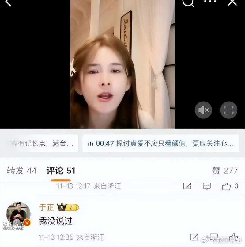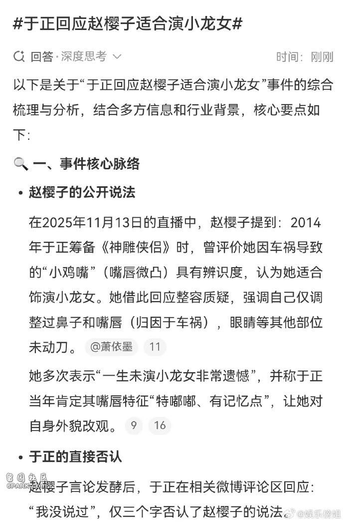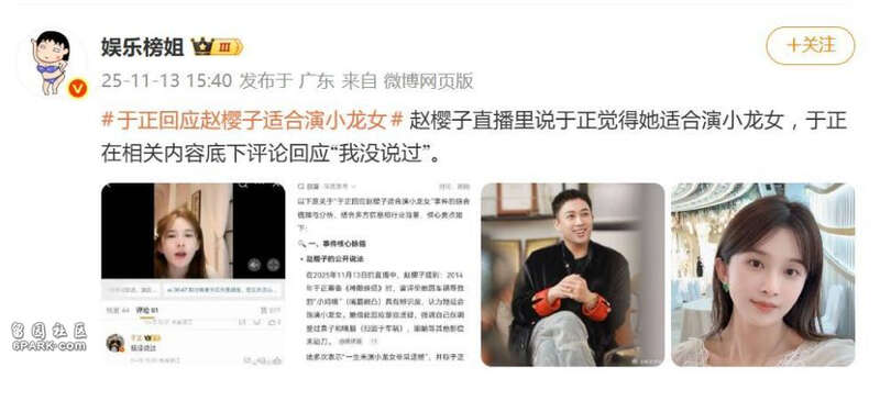 直播镜头前,赵樱子轻抚嘴唇讲述“车祸改变容貌”的故事时,或许未曾料到这场精心设计的叙事会遭遇最凌厉的拆解。11月13日,她在直播中声称于正认为她“适合演小龙女”,并强调自己仅调整过鼻子和嘴唇,眼睛始终保持原生状态,这番借经典角色回应整容质疑的操作,原本堪称流量收割的完美模版。然而于正在相关微博下的三字评论“我没说”,如同利刃划破泡沫,让这场单方面建构的对话瞬间坍缩成罗生门。