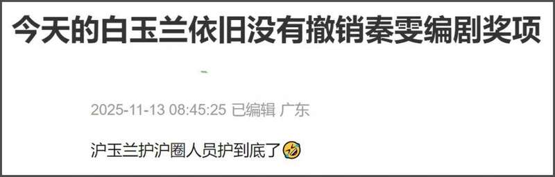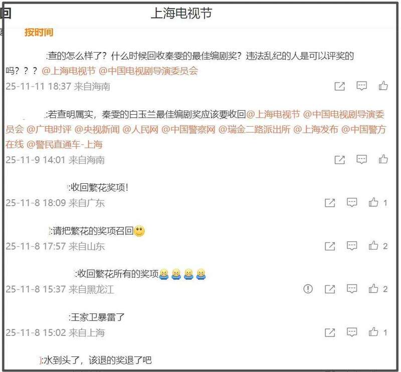 不少网友表示如果录音为真,那就表示秦雯并不是《繁花》唯一编剧,再加上她有违法劣迹,应该撤回她的相关奖项,白玉兰奖的官微评论区都沦陷了。