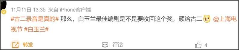 目前,网友已经开始呼吁要撤回秦雯凭借《繁花》所获的奖项,白玉兰奖的官微评论区彻底沦陷了。古二因为编剧署名问题,多次晒出会议录音,自证参与编写《繁花》剧本,顺便曝光了编剧秦雯的各种丑事,打警察、找枪手、抄剧本、嘴同事……