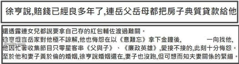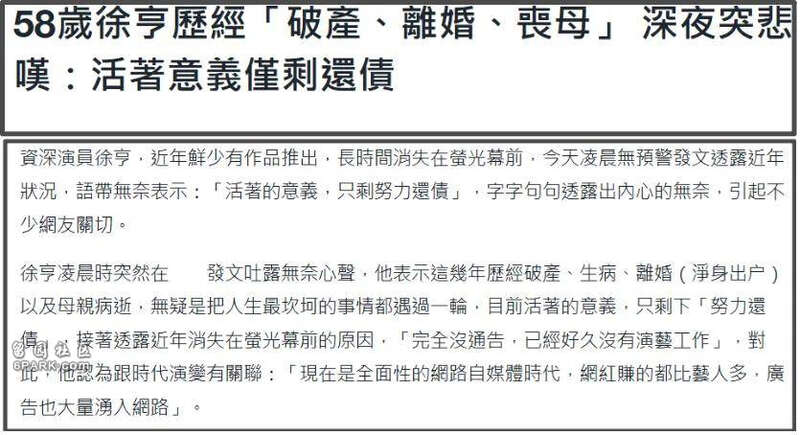还好,徐亨还算有担当,很明显,声称因性格不合离婚,是徐亨努力保留的最后一点体面,中年夫妻无法走下去,多半是因为还不完的债,离了婚的徐亨直接净身出户,同时强调由他一人承担所有债务——此时徐亨还有2亿台币欠债没还,也就是4000多万人民币。