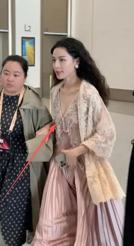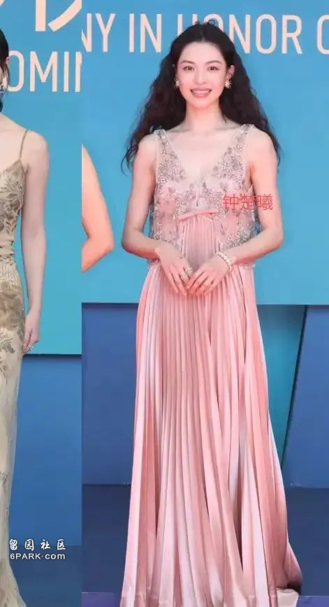 说实话,这刺绣粉裙、深V领设计,配上这张高级脸,真的是超级耐看。脖子里没戴任何配饰,完美的锁骨和肩颈线让人羡慕。