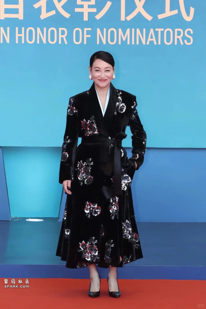 女神惠英红也来了,她这身行头一看就不简单。黑色大衣、系着腰带,踩着尖头的高跟鞋,单手插兜的模样太酷了。