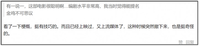 《家庭简史》是电影界新人作品,该片得到了柏林国际电影节、香港国际电影节、台北电影节国际新导演竞赛、北京电影节等的青睐,纷纷入围,其中获得了最受瞩目导演及艺术贡献两个大奖,前途不可限量。如今被金鸡奖除名,有网友根据其入围了台北电影节信息猜测片方是不是偷偷报名了某劣迹奖,触及了底线。