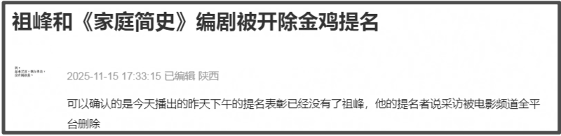 顺着祖峰被除名一事扒皮,发现《家庭简史》编剧提名也被金鸡奖开除。与此同时,祖峰参与的“提名者说”采访也被六公主全平台下架删除,事情看起来并不简单。