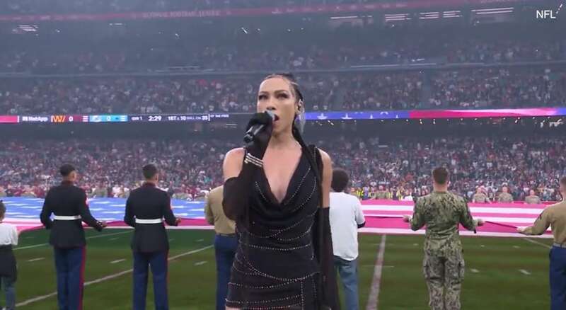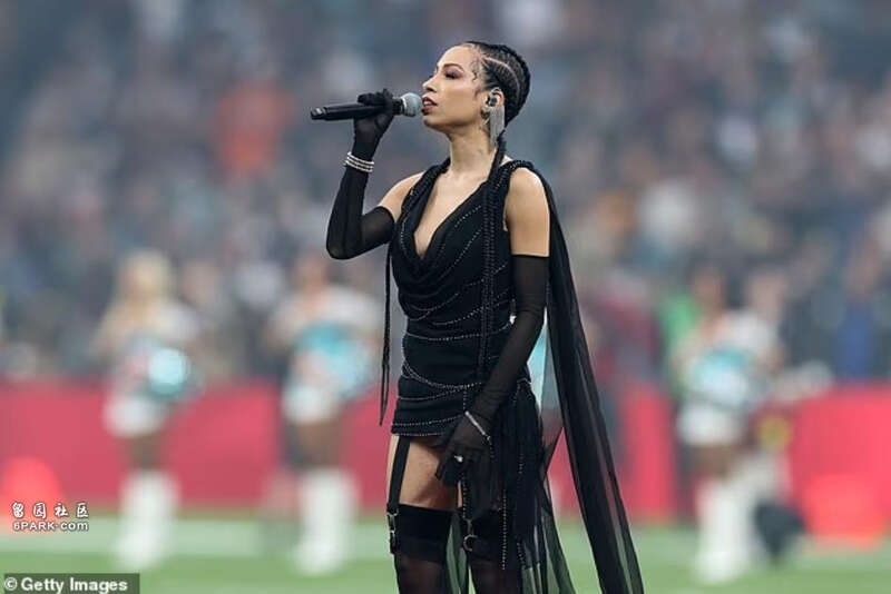 当时,帕西安穿着一件超短的深V黑色迷你裙,搭配黑色长筒丝袜和吊袜带,十分投入地唱着美国国歌。