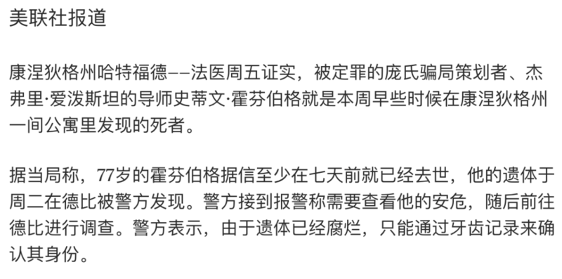 2022年8月23日,霍芬伯格被发现死于康涅狄格州德比市的公寓内,警方表示他们认为他是自然死亡。