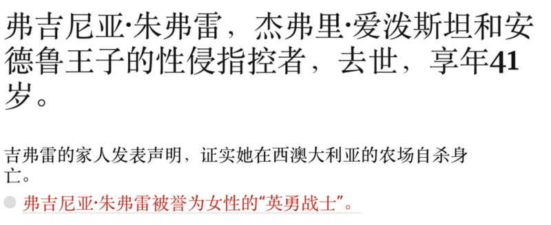即便是最被公众记住的女性受害者——那位与安德鲁王子合影、公开喊出“我不会自杀”的Virginia Giuffre。