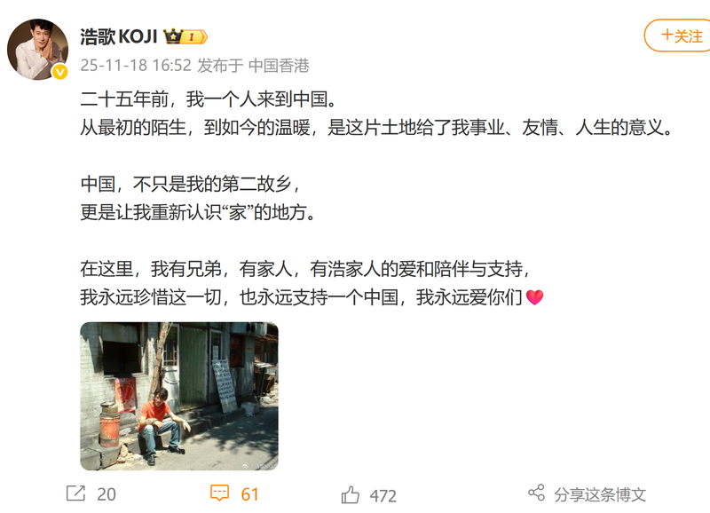 矢野浩二写道,“二十五年前,我一个人来到中国。从最初的陌生,到如今的温暖,是这片土地给了我事业、友情、人生的意义。中国,不只是我的第二故乡,更是让我重新认识‘家’的地方。在这里,我有兄弟,有家人,有浩家人的爱和陪伴与支持,我永远珍惜这一切,也永远支持一个中国,我永远爱你们。”