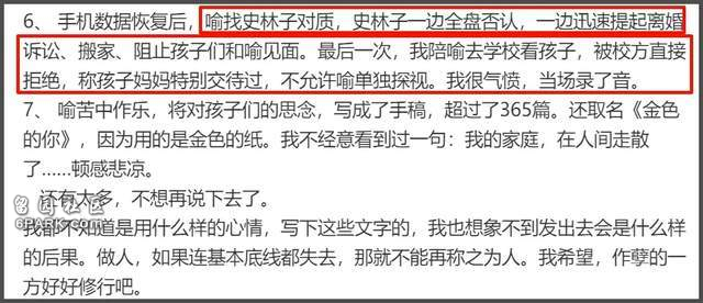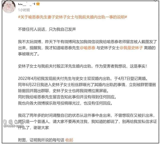 然而随后,史林子的出轨对象付某的前妻发声了,证实了史林子介入自己婚姻,导致离婚。自己是在2022年4月初发现两人不正当关系,离婚后同年6月,她就曾留言给喻恩泰,爆料其妻子出轨的事,这一点也跟喻恩泰好友的爆料对上了。根据好友的爆料,喻恩泰就是看到了留言,才想着 去恢复史林子手机聊天记录,结果恢复之后让他大跌眼镜。