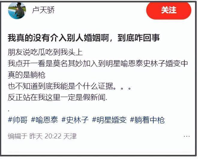 原来喻恩泰好友晒出的聊天记录的照片,是颜值博主卢天骄在 2017 年晒出的一张自拍。另一张照片同样是卢天骄在社交平台分享的照片,不知怎么却成了史林子的出轨对象。