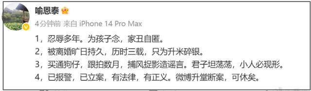第一,他表示忍辱多年,为了孩子,不想谈家丑;第二,被离婚旷日持久,历时三载,只为升米碎银;第三,买通狗仔,跟拍数月,捕风捉影造谣言。君子坦荡荡,小人必现形;第四,已报警,已立案,有法律,有正义。微博升堂断案,可休矣。