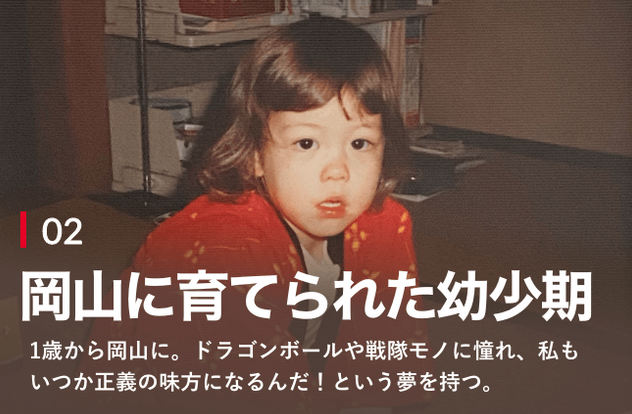 她在母亲的故乡冈山县长大,喜欢看《龙珠》和战队题材作品,希望有一天自己也能成为正义的盟友。