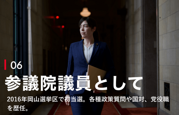 2016年,她以自民党公认候选人身份返回故乡,在冈山参加参议院选举,并顺利当选,历任各种政策顾问及党内职务。