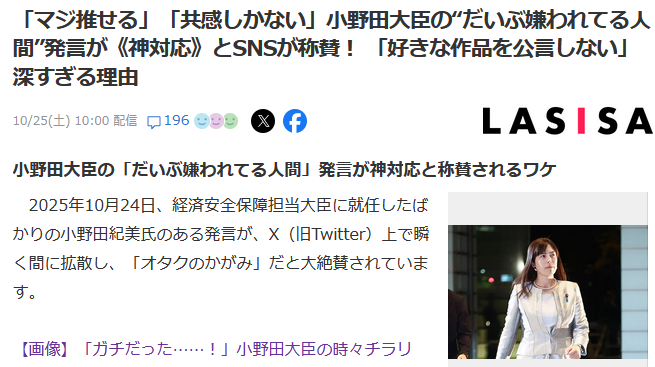 小野田纪美的回复耐人寻味:“我是一个被讨厌的人,为了防止喜欢那些作品的人也被讨厌,我会控制自己不在正式公开场合讨论这些东西。”