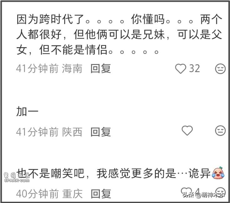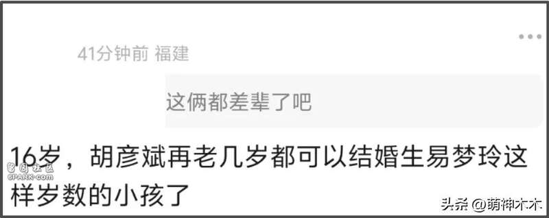 暂时不提胡彦斌和易梦玲互相配不配得上,主要是男方大了女方16岁呀,虽说十几岁的年龄差放在娱乐圈不算少见,但网友一想到胡彦斌努努力,从年龄上甚至可以生出一个易梦玲了,还是觉得有些不适。