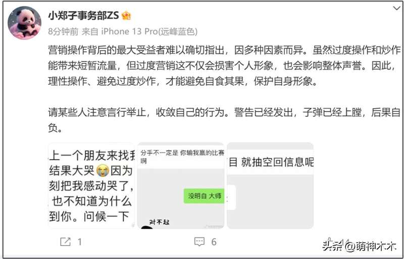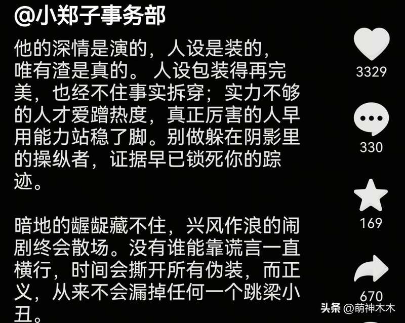 该账号还再度提到,“实力不够的人才爱蹭热度”,喊话别躲在阴影里操纵。此前,郑爽工作室曾晒工作室指责胡彦斌过度炒作,内涵他踩着郑爽把自己营销成“纯爱战神”。如今胡彦斌曝光新恋情,郑爽又被拉出来做比较,怪不得会发文内涵。