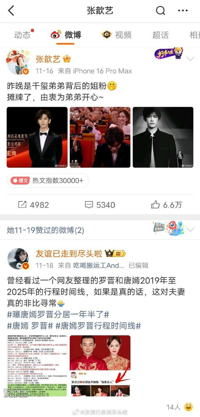 就在舆论持续升温时,更多背景信息浮出水面,让整件事显得更为复杂。原来,罗晋自2024年底其父亲病情恶化后,便推掉两部男主戏约,全职在京照料,直至父亲于2025年11月19日离世——巧合的是,这一天正是张歆艺点赞的日子。而唐嫣则常驻上海,一边育儿一边兼顾事业,这种分工是夫妻双方协商后的家庭安排。唐嫣也曾公开表示,演员行业聚少离多是常态,他们早已习惯这种异地模式。
