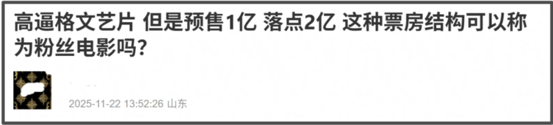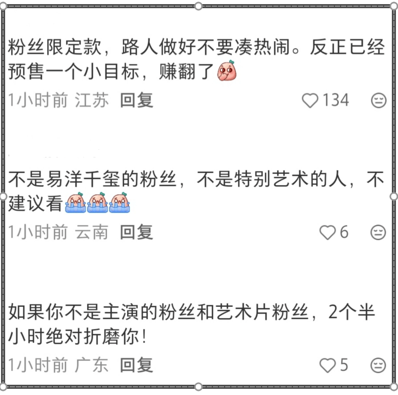 定位为文艺片的电影,在预售已经突破一亿票房的情况下,票房最终落点仅仅2亿,这样的票房结构是否意味着该片可以被称为是粉丝电影?上映前,粉丝冲着偶像冲预售票房;上映后,粉丝为了偶像走进电影院,继续为偶像“氪金”。有网友大胆推测,如果该片的主演不是易烊千玺的话,那么票房可能连一千万都突破不了。