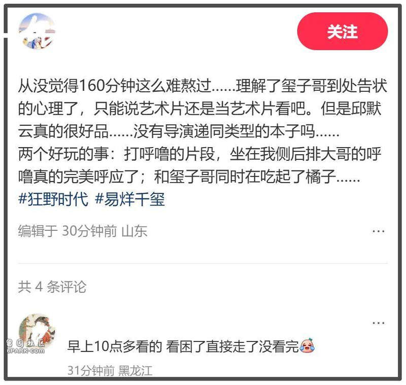 艺术电影也好,粉丝电影也罢。《狂野时代》的票房成绩大概率逃不过高开低走的命运了,希望追求艺术的导演们也能多多考虑普通观众的感受,叙事和艺术从来都不是不可兼得的,包裹在“艺术”皮囊之下的曲高和寡又何尝不是一种导演对观众展现出的自上而下的傲慢呢?