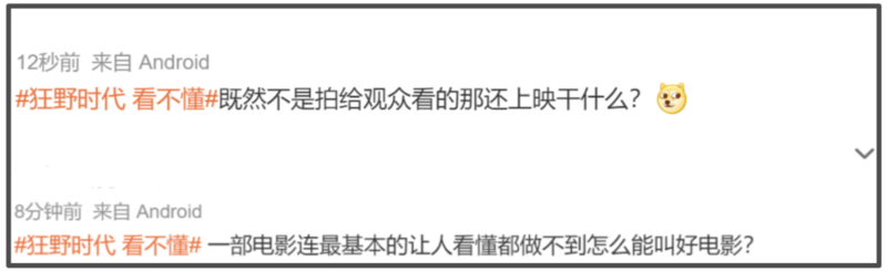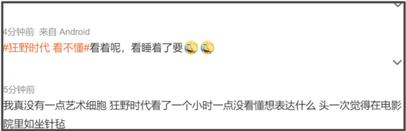 另外,《狂野时代》上映之日,第一波影评出炉之后,“《狂野时代》看不懂”的话题直接登上了高位热搜。热搜广场上,大批的网友叙述着自己不愉快的观影经历,直言“要看睡着了”、“头一次觉得在电影院里如坐针毡”。此外,还有人发出灵魂提问“一部电影连最基本的让人看懂都做不到,那么怎么能叫好电影”,这样的电影上映的意义是什么?