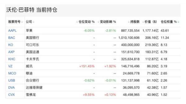 值得注意的是,在 2020 年第三季度持仓报告中,伯克希尔 · 哈撒韦曾向 SEC 申请对部分资讯保密。在去年第四季度持仓报告中,答案被揭晓,该公司大幅买入通信巨头威瑞森和能源巨头雪佛龙的股票。报告显示,截至去年四季度末,伯克希尔持有 1.467 亿股威瑞森股票,价值 86 亿美元;持有 4850 万股雪佛龙股票,价值 41 亿美元。这两只股票也进入了伯克希尔 · 哈撒韦去年四季度的前十大持仓名单中。