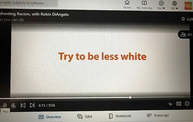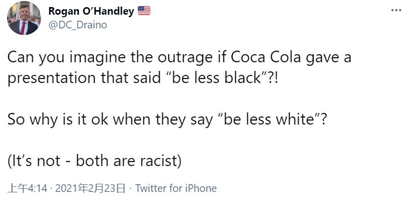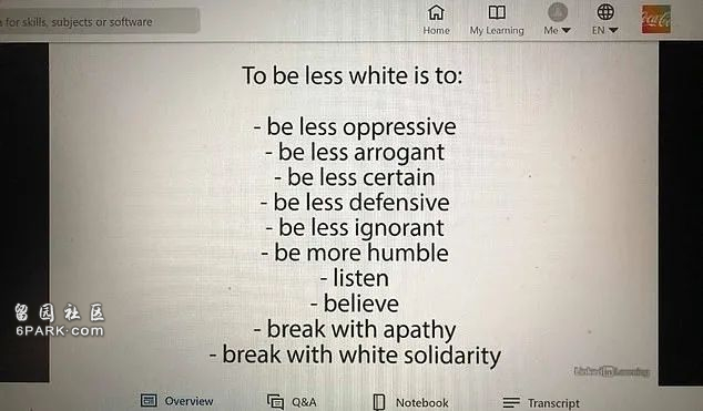 在这周,有人在社交平台上曝光了一组可口可乐在线员工培训会上内容的照片,并抨击几张幻灯片上的内容涉嫌“歧视白人”。