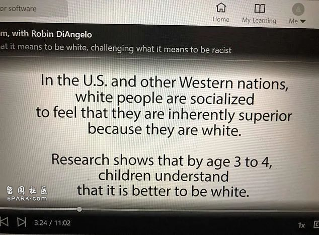 照片中可以看到这些幻灯片来自于一个11分钟的视频,视频的标题为“与罗宾·迪安吉洛一起面对种族主义”。