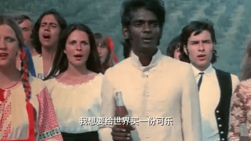 一起和谐地唱着可口可乐的广告曲:“我想给世界来杯可口可乐(I’d like to buy the world a Coke)。”