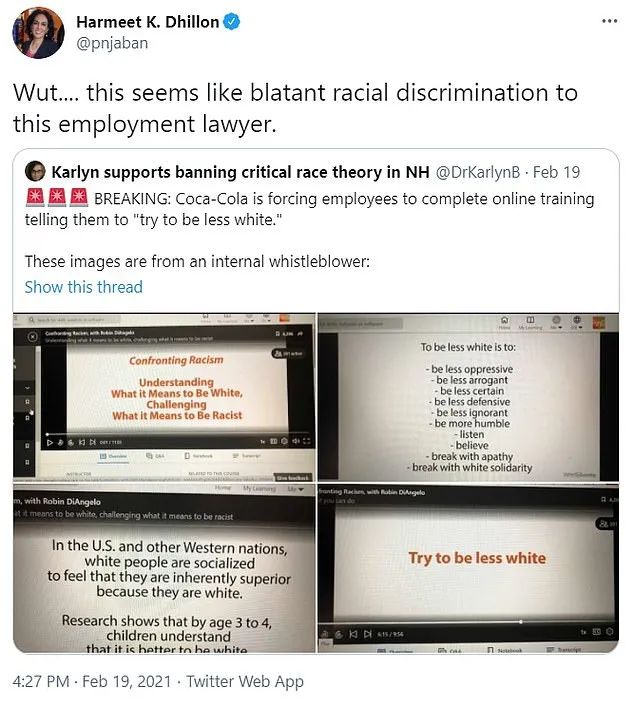 加利福尼亚共和党全国委员会领导人Harmeet K. Dhillon也转推表示,在她这位就业律师看来,这听起来是公然的种族歧视。