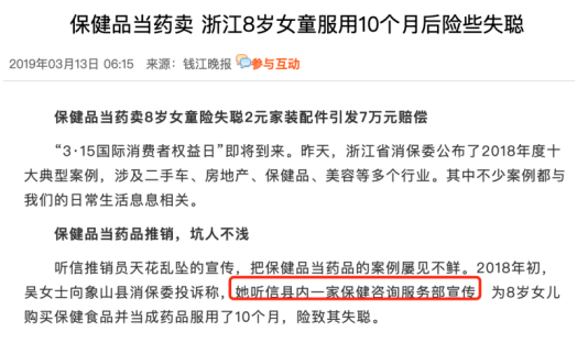 2018年,浙江一位8岁女童家长吴女士错把保健品当药喂给女儿吃,差点导致女儿失聪。