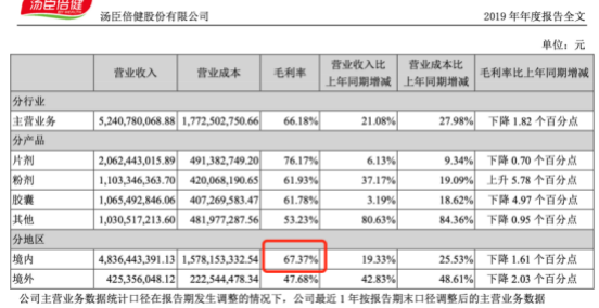 从上市公司汤臣倍健2019年财报看出,其境内毛利率为67.37%,境外毛利率为47.68%。