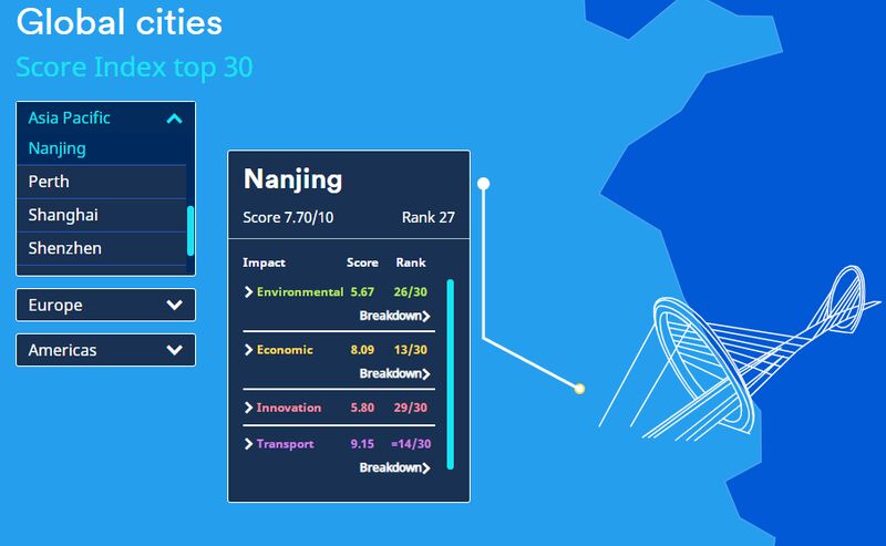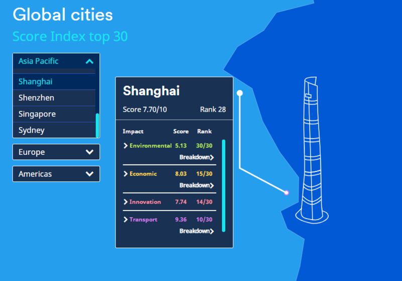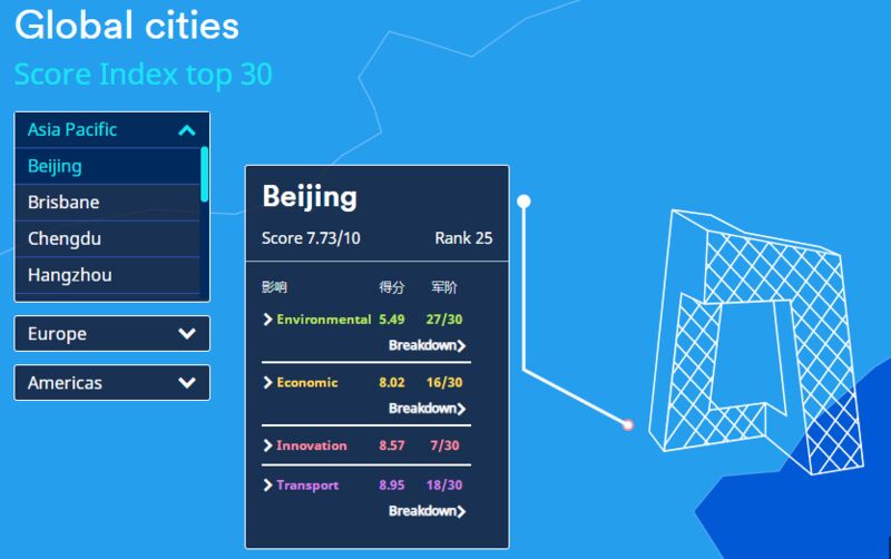 《全球城市指数报告》的评价体系:环境、经济、创新与交通几个方面。