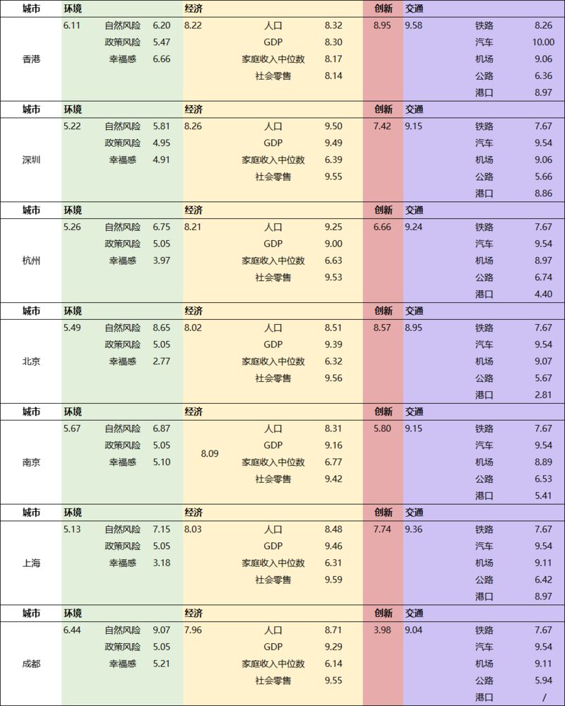 从具体得分可以很明显看到,环境方面,得分最高的是成都,经济方面得分最高的是深圳,创新方面得分最高的是香港,交通方面得分最高的是香港。