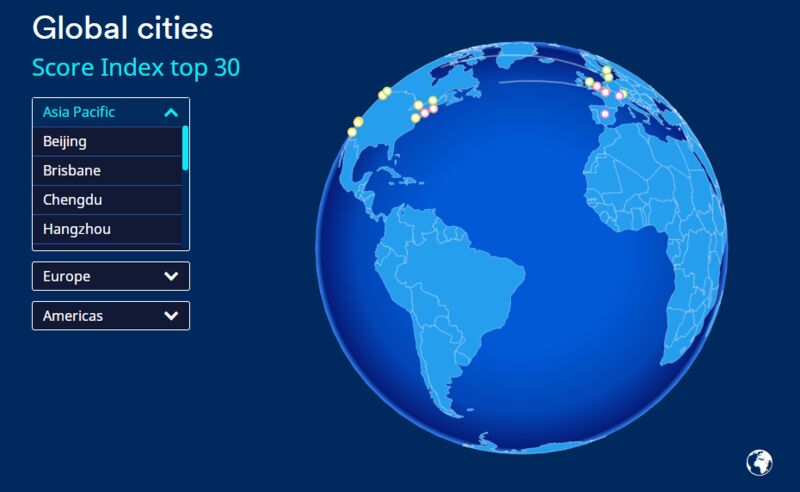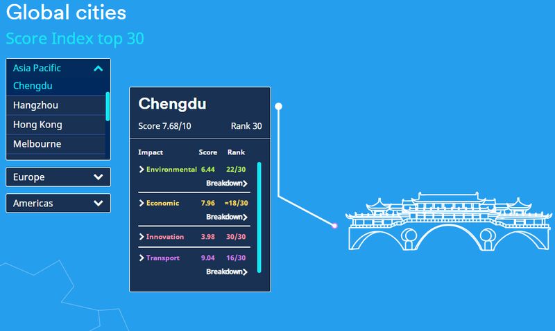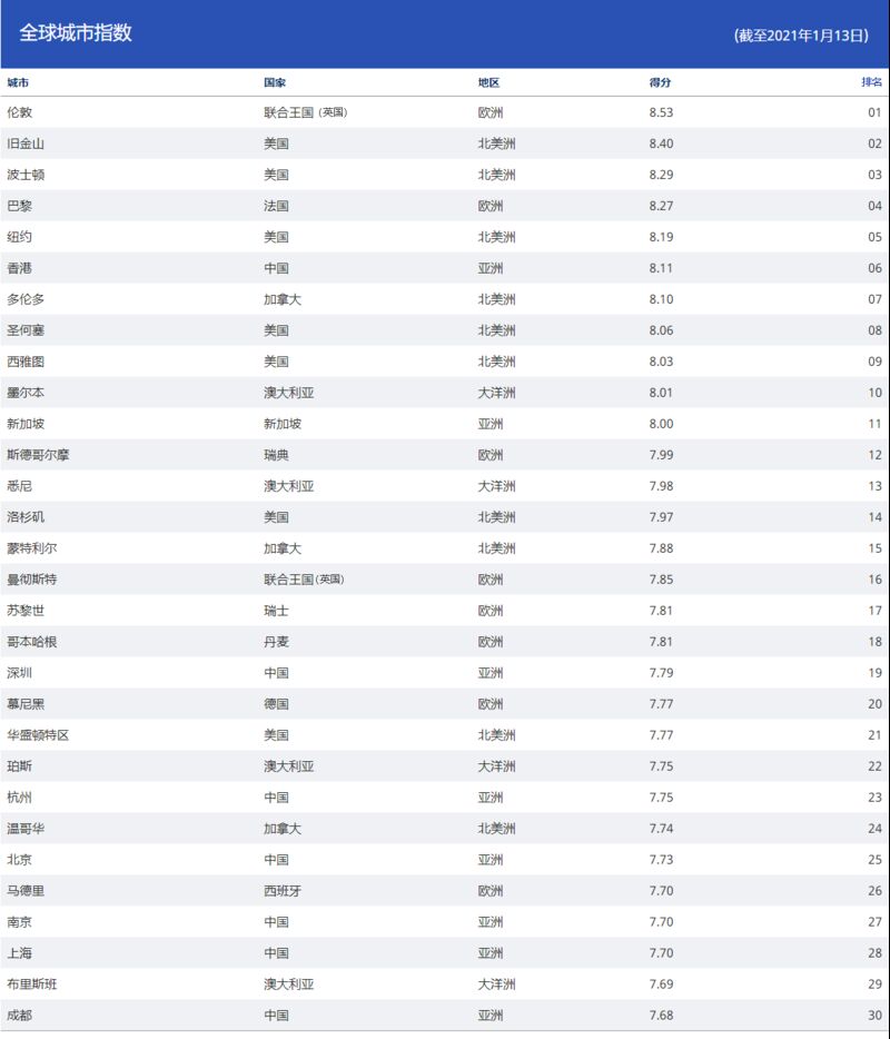 从前30可以看到,中国城市中排名第一的是香港(全球第6),排名第二的是深圳(全球19),第三名是杭州(全球23),第四名是北京(全球25),第五名是南京(全球27),第六名是上海(全球28),第七名是成都(全球30)。