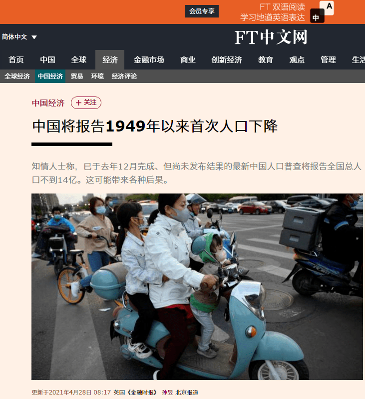 这几天,很多人在朋友圈可能都看到了一则来自FT的消息,标题还是很惊人的,大意是中国人口将会出现70年以来的首次下降。
