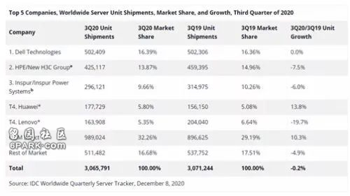 另外企业业务也是类似的,就以服务器发货为例子,下图是IDC发布的2020年第三季度全球服务器发货量,华为发货17.77万台。
